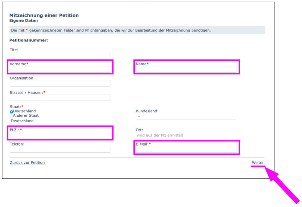 Ihre Daten werden nicht öffentlich angezeigt. Sie dienen nur dazu, die Mitzeichnung korrekt zu erfassen. Nachdem alle Pflichtfelder ausgefüllt sind, klicken Sie auf „Weiter“.